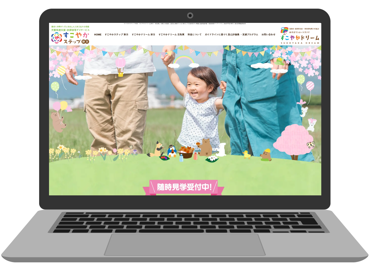 今回2つ目のホームページでご依頼いただきました。小さいお子さん向きのサイトですのでポップで優しく、可愛いデザインを念頭に置いて、しかも保護者の方、特にママ目線でわかりやすく使いやすく制作いたしました。本来1つの事業に1つのホームページが好ましいのですが、ご要望ですので1つのホームページで2つの事業がわかりやすいように制作いたしました。